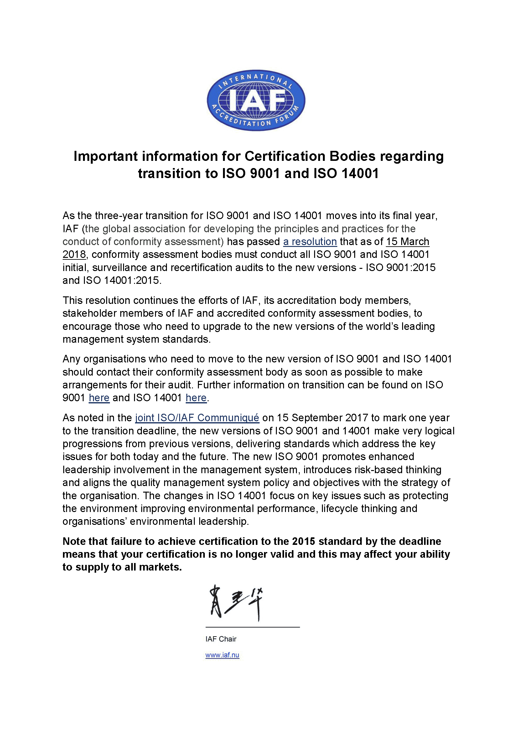 IAF官網發布了《對認證機構實施ISO 9001:2015及ISO 14001:2015轉版認證的重要通告》。要求自2018年的3月15日起,認證機構對實施的所有ISO 9001及ISO 14001認證必須按新版執行,包括初次審核、監督審核及換證審核。